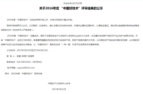 “中(zhong)(zhong)(zhong)(zhong)國(guo)(guo)(guo)(guo)好(hao)(hao)(hao)(hao)技(ji)(ji)(ji)術(shu)(shu)”是(shi)為(wei)深入貫(guan)徹(che)落實(shi)黨中(zhong)(zhong)(zhong)(zhong)央、國(guo)(guo)(guo)(guo)務(wu)院關(guan)于實(shi)施創(chuang)(chuang)新驅動發展(zhan)(zhan)戰略和“大眾創(chuang)(chuang)業、萬眾創(chuang)(chuang)新”的(de)(de)(de)(de)精神,不斷激發全(quan)社會的(de)(de)(de)(de)創(chuang)(chuang)新創(chuang)(chuang)業活力,營(ying)造(zao)全(quan)民(min)創(chuang)(chuang)新的(de)(de)(de)(de)良(liang)好(hao)(hao)(hao)(hao)氛圍,由中(zhong)(zhong)(zhong)(zhong)國(guo)(guo)(guo)(guo)生產(chan)力促進(jin)中(zhong)(zhong)(zhong)(zhong)心(xin)(xin)協會同國(guo)(guo)(guo)(guo)家(jia)相關(guan)機構和企(qi)業共(gong)同發起和舉(ju)辦(ban)的(de)(de)(de)(de),此(ci)獎項(xiang)評選為(wei)每年一次。在2016年度“中(zhong)(zhong)(zhong)(zhong)國(guo)(guo)(guo)(guo)好(hao)(hao)(hao)(hao)技(ji)(ji)(ji)術(shu)(shu)”征集中(zhong)(zhong)(zhong)(zhong),得(de)到了全(quan)國(guo)(guo)(guo)(guo)各(ge)級生產(chan)力促進(jin)中(zhong)(zhong)(zhong)(zhong)心(xin)(xin)和相關(guan)企(qi)業的(de)(de)(de)(de)大力支持(chi),共(gong)征集科技(ji)(ji)(ji)創(chuang)(chuang)新產(chan)品(pin)和可產(chan)業化技(ji)(ji)(ji)術(shu)(shu)成果286項(xiang),獲(huo)得(de)“中(zhong)(zhong)(zhong)(zhong)國(guo)(guo)(guo)(guo)好(hao)(hao)(hao)(hao)技(ji)(ji)(ji)術(shu)(shu)”稱號有108個項(xiang)目(mu)。評審“中(zhong)(zhong)(zhong)(zhong)國(guo)(guo)(guo)(guo)好(hao)(hao)(hao)(hao)技(ji)(ji)(ji)術(shu)(shu)”這項(xiang)工作的(de)(de)(de)(de)目(mu)的(de)(de)(de)(de),就是(shi)要把蘊藏在民(min)間的(de)(de)(de)(de)好(hao)(hao)(hao)(hao)技(ji)(ji)(ji)術(shu)(shu)變成好(hao)(hao)(hao)(hao)產(chan)品(pin),把好(hao)(hao)(hao)(hao)產(chan)品(pin)推向(xiang)國(guo)(guo)(guo)(guo)內外市場,讓中(zhong)(zhong)(zhong)(zhong)國(guo)(guo)(guo)(guo)的(de)(de)(de)(de)好(hao)(hao)(hao)(hao)產(chan)品(pin)變成中(zhong)(zhong)(zhong)(zhong)國(guo)(guo)(guo)(guo)的(de)(de)(de)(de)好(hao)(hao)(hao)(hao)品(pin)牌(pai)(pai),讓中(zhong)(zhong)(zhong)(zhong)國(guo)(guo)(guo)(guo)的(de)(de)(de)(de)好(hao)(hao)(hao)(hao)品(pin)牌(pai)(pai)產(chan)生巨大經濟(ji)效益和社會影響(xiang)。讓“中(zhong)(zhong)(zhong)(zhong)國(guo)(guo)(guo)(guo)好(hao)(hao)(hao)(hao)技(ji)(ji)(ji)術(shu)(shu)”服務(wu)和支持(chi)“一帶一路”引領(ling)下的(de)(de)(de)(de)世界(jie)經濟(ji)發展(zhan)(zhan)新格局,讓“中(zhong)(zhong)(zhong)(zhong)國(guo)(guo)(guo)(guo)好(hao)(hao)(hao)(hao)技(ji)(ji)(ji)術(shu)(shu)”走(zou)出國(guo)(guo)(guo)(guo)門,走(zou)向(xiang)世界(jie)。