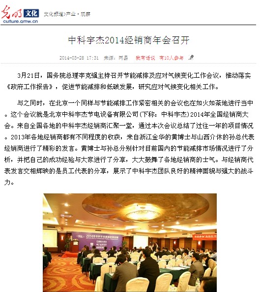 與(yu)(yu)(yu)之同(tong)時,在北京一(yi)(yi)個同(tong)樣(yang)與(yu)(yu)(yu)節(jie)能(neng)(neng)減(jian)排(pai)工作緊密相關的(de)(de)(de)會(hui)議也在如火如荼地(di)進(jin)行當中。這個會(hui)議就是北京中科(ke)宇杰(jie)節(jie)電(dian)設(she)備有(you)限公(gong)司(下稱:中科(ke)宇 杰(jie))2014年(nian)(nian)全國經(jing)銷(xiao)(xiao)(xiao)商(shang)大會(hui)。來(lai)自(zi)(zi)全國各(ge)地(di)的(de)(de)(de)中科(ke)宇杰(jie)經(jing)銷(xiao)(xiao)(xiao)商(shang)匯聚(ju)一(yi)(yi)堂,通過本次會(hui)議總(zong)結了過往一(yi)(yi)年(nian)(nian)的(de)(de)(de)項(xiang)目情況(kuang)。2013年(nian)(nian)各(ge)地(di)經(jing)銷(xiao)(xiao)(xiao)商(shang)都有(you)不(bu)同(tong)程度的(de)(de)(de)收(shou) 獲,來(lai)自(zi)(zi)浙(zhe)江金華的(de)(de)(de)黃博(bo)士與(yu)(yu)(yu)山(shan)西介休的(de)(de)(de)孫總(zong)代表(biao)經(jing)銷(xiao)(xiao)(xiao)商(shang)進(jin)行了精彩的(de)(de)(de)發(fa)言。黃博(bo)士與(yu)(yu)(yu)孫總(zong)分別針對目前國內(nei)的(de)(de)(de)節(jie)能(neng)(neng)減(jian)排(pai)市(shi)場情況(kuang)進(jin)行了分析(xi),并把自(zi)(zi)己(ji)的(de)(de)(de)成功經(jing)驗 與(yu)(yu)(yu)大家進(jin)行了分享(xiang),大大鼓舞(wu)了各(ge)地(di)經(jing)銷(xiao)(xiao)(xiao)商(shang)的(de)(de)(de)士氣。與(yu)(yu)(yu)經(jing)銷(xiao)(xiao)(xiao)商(shang)代表(biao)發(fa)言交相輝映的(de)(de)(de)是員(yuan)工代表(biao)的(de)(de)(de)分享(xiang),展示了中科(ke)宇杰(jie)團隊良好的(de)(de)(de)精神面貌(mao)與(yu)(yu)(yu)強大的(de)(de)(de)戰斗力。